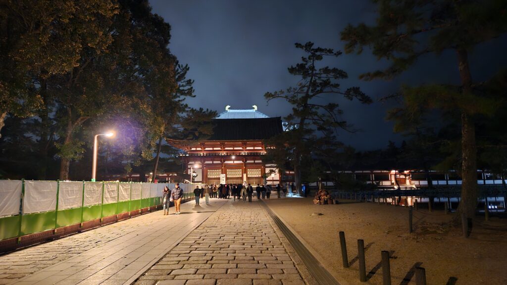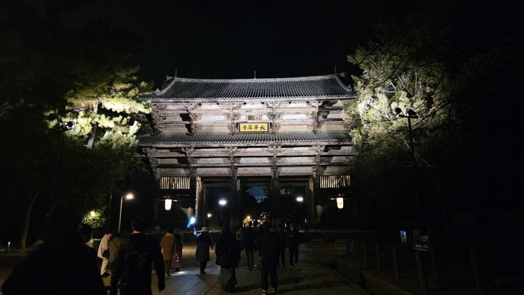 夜10時、東大寺の入り口である南大門に来ました。鎌倉時代に建てられた国宝で、中には運慶快慶で有名な金剛力士像があります。