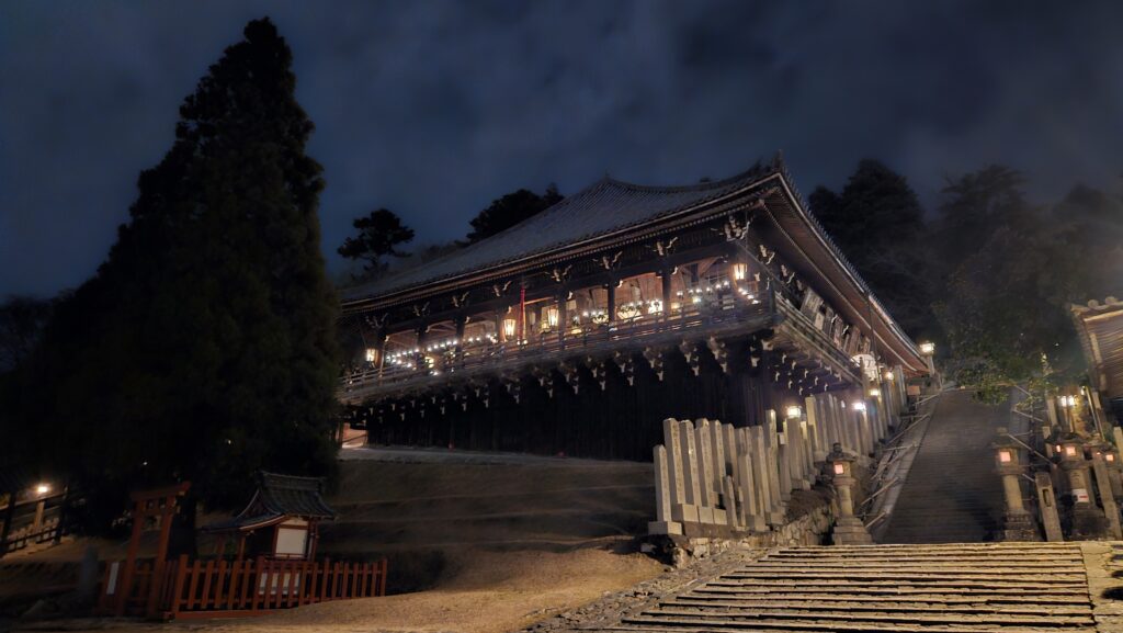 まだ時間があるのでちょっと他のところも行ってみましょう。鐘楼よりさらに奥に行くと二月堂という建物があります。二月堂は修二会、通称「お水取り」と呼ばれる行事で使われる建物です。